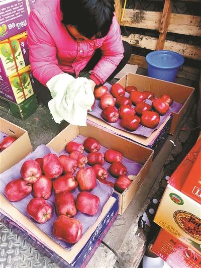 臨近中午,北青報(bào)記者目睹了這家商販給花牛蘋果打蠟的全過程。“你是要買打過蠟的蘋果嗎?我很快就能擦好的,你看要多少箱?”這位商販邊說邊將普通紙箱里的蘋果按個頭大小分揀到禮盒里,隨后用一條毛巾將蘋果挨個擦拭,原本“灰頭土臉”的花牛蘋果經(jīng)過這樣一擦,瞬間變得光鮮亮麗起來。