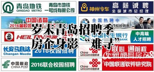 往年的歲末,樓市都會(huì)進(jìn)入一段“平穩(wěn)期”,許多房地產(chǎn)企業(yè)都會(huì)啟動(dòng)“招兵買馬”為下一年公司注入新活力,補(bǔ)充新生力量。不過(guò),如今2016年已近在咫尺,青島各家房企卻大有偃旗息鼓之勢(shì),不僅招聘會(huì)上鮮見(jiàn)身影,各招聘網(wǎng)站上也難尋蹤跡。