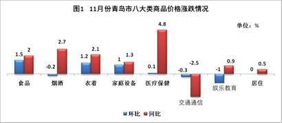 11月份,構(gòu)成CPI的八大類商品和服務(wù)項(xiàng)目環(huán)比價(jià)格 “四升一平三降”。其中,食品類、衣著類、家庭設(shè)備用品及維修服務(wù)類、醫(yī)療保健和個(gè)人用品類分別上漲1.5%、1.2%、1%和0.1%;居住類持平;娛樂教育文化用品及服務(wù)類、交通和通信類、煙酒類分別下降1%、0.3%和0.2%。