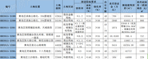 根據(jù)拍賣公告顯示,編號(hào)HD2015-3199,位于黃島區(qū)濱海公路北、204國(guó)道東,土地面積12954㎡,規(guī)劃建筑面積15544.8㎡,土地用途為商務(wù)金融用地,容積率≤1.2,建筑密度≤35%,綠地率≥30%,出讓年限40年,出讓起始樓面地價(jià)為905元/㎡,競(jìng)買保證金704萬元。