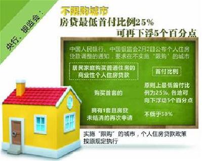 中國人民銀行、中國銀監(jiān)會(huì)2日公布個(gè)人住房貸款調(diào)整的通知,要求在不實(shí)施“限購”的城市,居民家庭購買首套普通住房的商業(yè)性個(gè)人住房貸款,在最低首付25%的基礎(chǔ)上可再下浮5個(gè)百分點(diǎn);對(duì)擁有1套住房且房貸未結(jié)清的家庭,再次申請(qǐng)商業(yè)性個(gè)人住房貸款購買普通住房,最低首付款比例調(diào)整為不低于30%。
