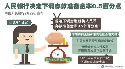 昨日下午6時,中國人民銀行發(fā)布消息,決定自2016年3月1日起,普遍下調(diào)金融機構人民幣存款準備金率0.5個百分點,以保持金融體系流動性合理充裕,引導貨幣信貸平穩(wěn)適度增長,為供給側(cè)結(jié)構性改革營造適宜的貨幣金融環(huán)境。在影響方面,業(yè)內(nèi)人士稱此次降準將降低銀行理財收益率,但對股市、樓市等是利好。
