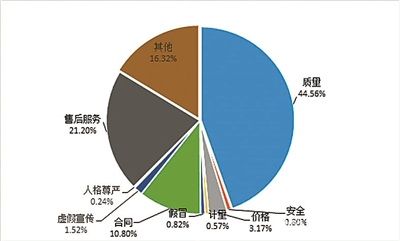 根據(jù)投訴性質(zhì)分析,在2015年全國消費(fèi)者協(xié)會(huì)共受理的投訴中,質(zhì)量問題占44.56%,售后服務(wù)問題占21.20%,合同問題占10.80%,價(jià)格問題占3.17%,虛假宣傳問題占1.52%,假冒問題占0.82%,安全問題占0.80%,計(jì)量問題占0.57%,人格尊嚴(yán)問題占0.24%,其他問題占16.32%。產(chǎn)品質(zhì)量、售后服務(wù)和合同問題仍是引發(fā)投訴的主要原因,占投訴總量的七成以上。