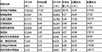 與2014年相比,商品大類投訴中,家用電子電器類、服裝鞋帽類、交通工具類、日用商品類和房屋建材類投訴量仍居前五位。除交通工具類投訴上升了1.08%外,其他商品類投訴均有所下降。