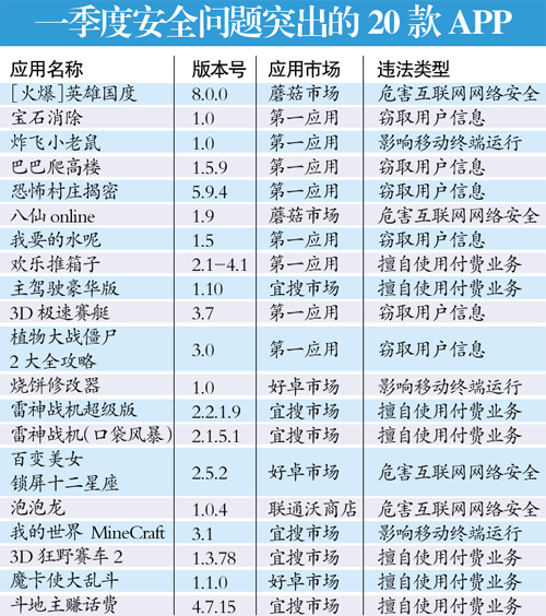 昨日,廣東省公安廳網(wǎng)警總隊(duì)開通“違法APP曝光臺(tái)”,曝光了第一季度安全問題突出的20款A(yù)PP,這些APP要么竊取用戶信息,要么擅自使用付費(fèi)業(yè)務(wù),有的還危害互聯(lián)網(wǎng)網(wǎng)絡(luò)安全,主要為一些游戲類的APP應(yīng)用,有的下載量高達(dá)數(shù)百萬。省公安廳提醒網(wǎng)民加強(qiáng)防范、及時(shí)卸載。
