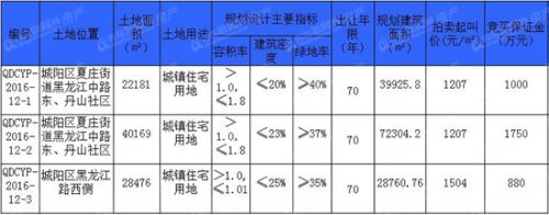 本次出讓的3宗地中有兩宗位于夏莊街道黑龍江中路東側(cè)、丹山社區(qū),全部為純住宅用地,容積率均為1.8,其中QDCYP-2016-12-1地塊面積22181㎡,約合33.27畝,規(guī)劃建筑面積39925.8平米,起拍價(jià)1207元/㎡;QDCYP-2016-12-2地塊面積40169㎡,約合60.25畝,規(guī)劃建筑面積72304.2平米,起拍價(jià)1209元/㎡。
