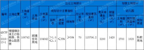 該宗地編號(hào)QDCYP-2016- 13-1,位于惜福鎮(zhèn)街道王沙路南側(cè)、鐵騎山路西側(cè),總面積106742㎡,用途為城鎮(zhèn)住宅用地。按照規(guī)劃,該宗地規(guī)劃建筑面積115796.2㎡,容積率1.1,建筑密度≤35%,綠地率≥30%。地塊的競(jìng)買保證金為8200萬元,樓面地價(jià)為1420元/㎡,據(jù)此計(jì)算,拍賣起始總價(jià)可達(dá)1.64億元。此外,該地塊還劃撥有一部分土地用于科教用地,未來配建幼兒園,這部分科教用地總占地面積2700㎡,未來規(guī)劃建筑面積1620㎡。