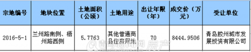 該宗地編號(hào)為2016-5-1,位于蘭州路南側(cè)、梧州路西側(cè),全部為普通商品住房用地,土地面積為5.7763公頃,出讓年限70年。