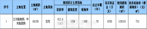 根據(jù)拍賣公告顯示,該地塊位于膠州市蘭州路南側(cè)、中宋路西側(cè),地塊總占地面積64155㎡,土地用途為住宅用地。未來(lái)規(guī)劃建筑面積128310㎡,地塊的整體容積率為2.0,起拍價(jià)為樓面地價(jià)731元/㎡,競(jìng)買保證金為4700萬(wàn)元人民幣。