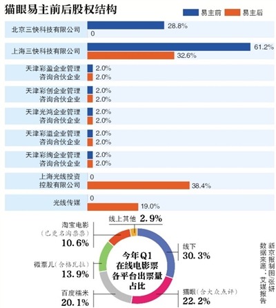 5月27日晚間,光線傳媒公告,通過(guò)換股、支付現(xiàn)金等方式獲得貓眼合計(jì)57.4%的股權(quán)。在線票務(wù)平臺(tái)貓眼電影將隨之由美大手中“易主”。光線成為控股股東。
