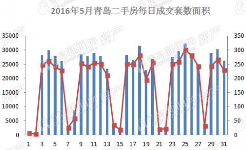 從每日成交情況來(lái)看,5月青島二手房成交超過(guò)100套的日子共有22天,其中單日成交超過(guò)300套的共有4天。成交峰值出現(xiàn)在25日,當(dāng)日成交二手房323套,總交易面積高達(dá)30099.71㎡,簽約的房源平均面積為93㎡。