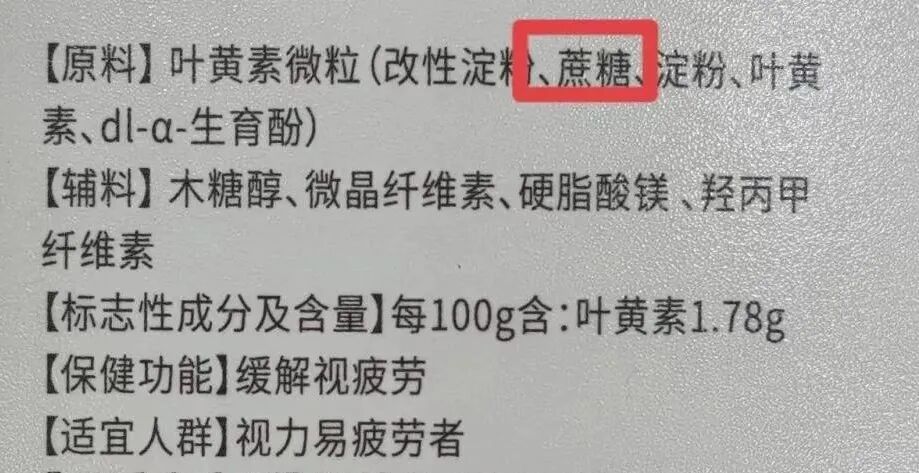 記者發(fā)現(xiàn),在一些葉黃素類保健品的配料表中,出現(xiàn)了蔗糖、食用葡萄糖、麥芽糊精等糖類,而葉黃素/葉黃素酯卻排在靠后的位置。