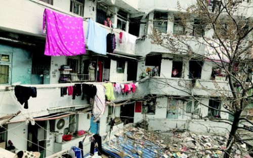 嘉禾路18號(hào)就在此次棚改范圍內(nèi)。這處筒子樓從外表看還不算破舊,但走進(jìn)去之后,樓道黑暗狹窄,走廊只有一米寬,還都堆著雜物,僅能容下一人通行。站在樓上往下看,樓下亂搭亂建,破爛不堪。