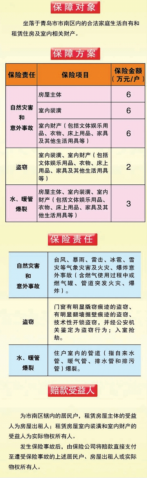 家庭財(cái)產(chǎn)保障險(xiǎn)為轄區(qū)內(nèi)坐落于青島市市南區(qū)行政區(qū)劃內(nèi)的家庭生活住房及室內(nèi)相關(guān)財(cái)產(chǎn)(住房包括自有房屋及租賃房屋,不含違法建筑、危險(xiǎn)建筑、非法占用的建筑及存放在里面的財(cái)產(chǎn)),提供自然災(zāi)害和意外事故、盜竊(門窗有明顯撬竊痕跡的盜竊、有明顯翻墻掘壁痕跡的盜竊、技術(shù)性開鎖盜竊,并經(jīng)公安機(jī)關(guān)鑒定為盜竊行為;入室搶劫)、水暖管(住戶室內(nèi)的管道——自來(lái)水管 、暖氣管 、排水管和排污管)爆裂等保險(xiǎn)項(xiàng)目,由中國(guó)太平洋財(cái)產(chǎn)保險(xiǎn)股份有限公司承保。理賠過(guò)程中 ,結(jié)合“一袋式”快遞 、“一證式”速賠、網(wǎng)銀支付和掃碼微理賠,全天候提供95500便捷理賠。