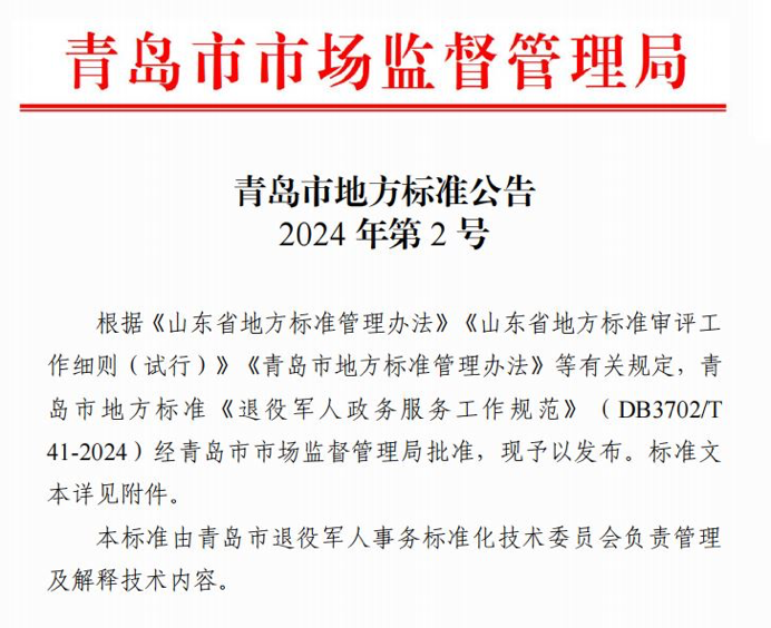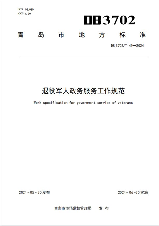 日前,青島市地方標(biāo)準(zhǔn)《退役軍人政務(wù)服務(wù)工作規(guī)范》正式獲批發(fā)布,該文件由青島市退役軍人事務(wù)局提出,青島市退役軍人服務(wù)中心負(fù)責(zé)起草,是山東省首個(gè)退役軍人政務(wù)服務(wù)市級(jí)地方標(biāo)準(zhǔn)。