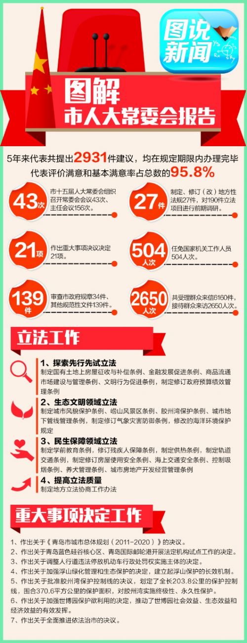 五年來,常委會抓住事關(guān)全局、群眾普遍關(guān)注的突出問題,依法行使重大事項決定權(quán),努力增強(qiáng)工作的針對性和實效性,包括作出關(guān)于《青島市城市總體規(guī)劃(2011-2020)》的決議,推動城市定位和智能要求更加符合本市實際和長遠(yuǎn)發(fā)展;作出關(guān)于青島藍(lán)色硅谷核心區(qū)、青島國際郵輪港開展法定機(jī)構(gòu)試點工作的決定;作出關(guān)于調(diào)整人行道違法停放機(jī)動車行政處罰權(quán)實施主體的決定等。