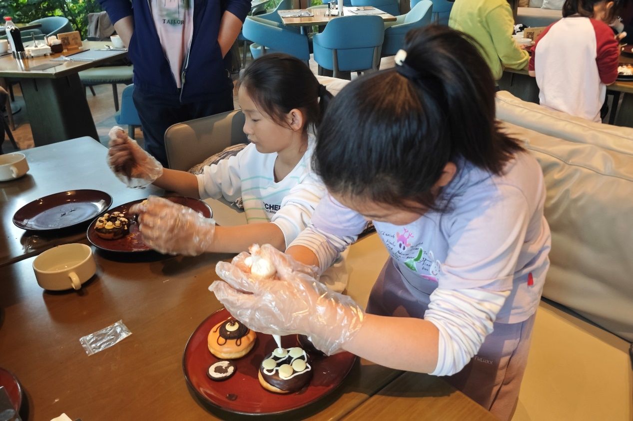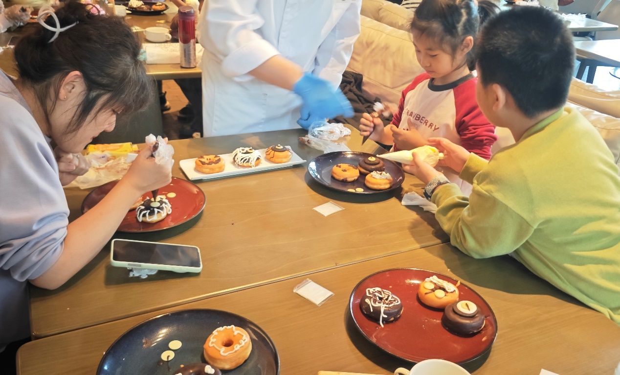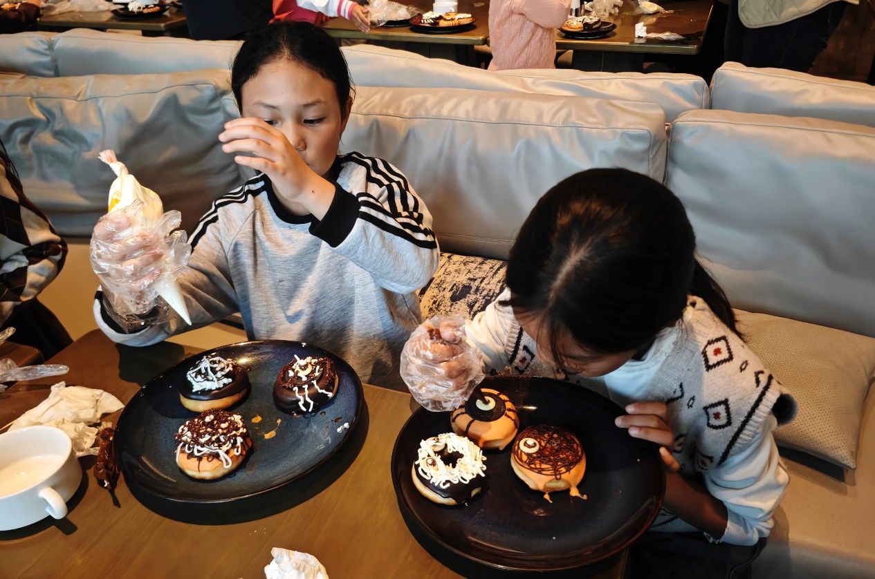 在張廚師長的耐心指導(dǎo)下,小記者們興致勃勃地投入到萬圣節(jié)甜甜圈的制作中。廚師長細(xì)致地講解著制作技巧,手把手教小記者們?nèi)绾巫龀龈鞣N不同趣味造型,如何用可愛的裝飾配件裝點(diǎn)甜甜圈。小記者們認(rèn)真專注,發(fā)揮著自己的創(chuàng)意,有的在甜甜圈上畫出搞怪的萬圣節(jié)鬼臉,有的用糖珠拼出可愛的圖案,不一會兒,一個(gè)個(gè)造型獨(dú)特、色彩繽紛的萬圣節(jié)甜甜圈就完成了。看著自己親手制作的甜品,小記者們臉上都洋溢著滿滿的成就感,紛紛拿起手機(jī)拍照留念,還忍不住品嘗起來,香甜的味道在口中散開,大家直呼“太好吃了”。