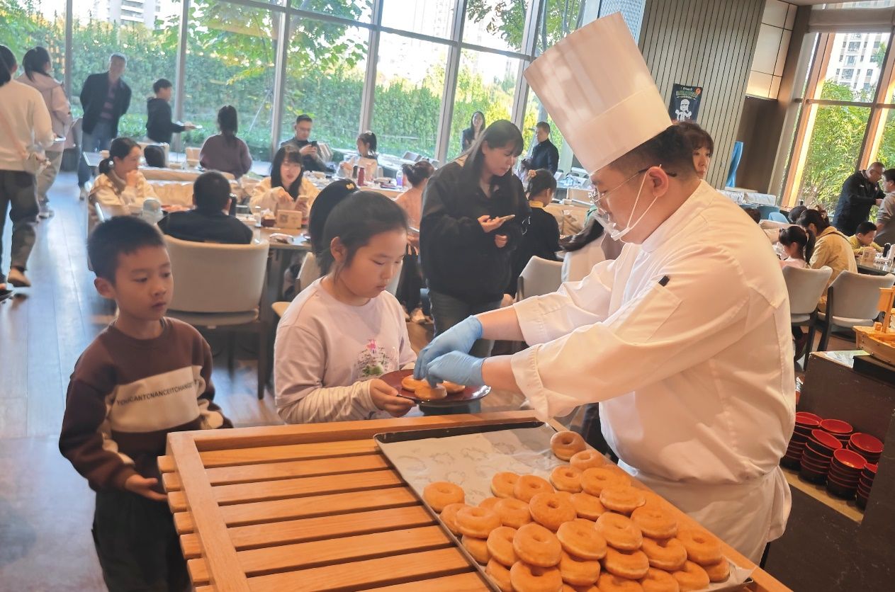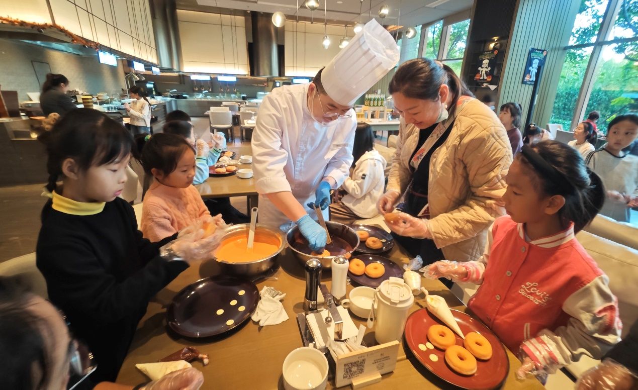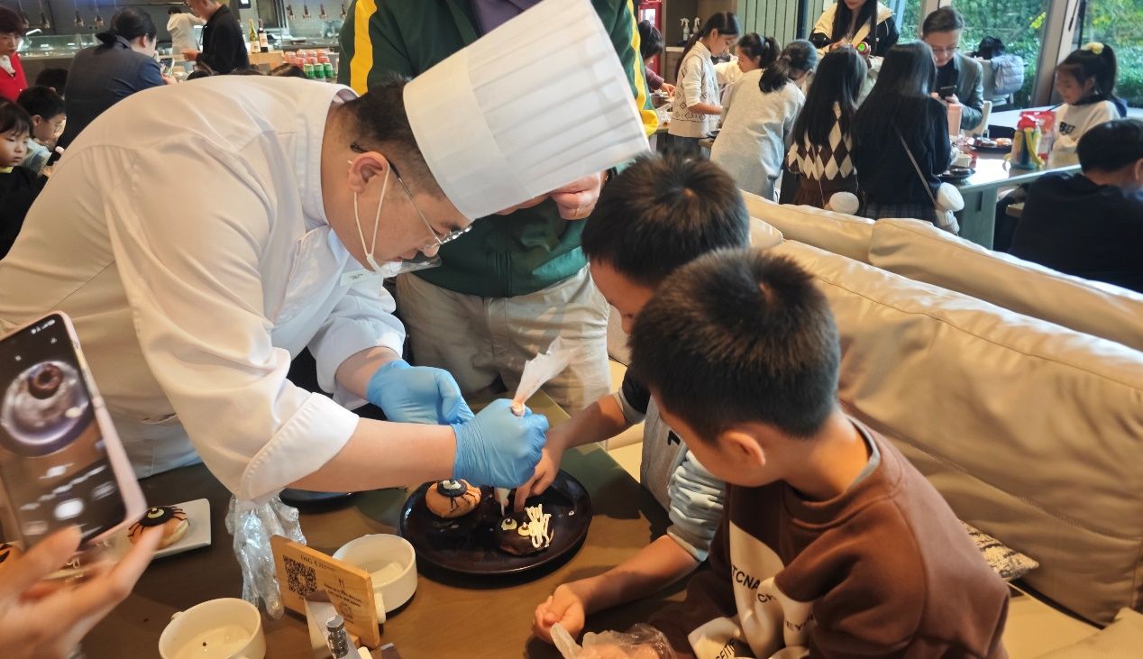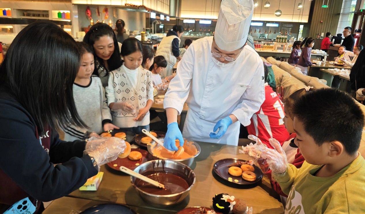 在張廚師長的耐心指導(dǎo)下,小記者們興致勃勃地投入到萬圣節(jié)甜甜圈的制作中。廚師長細(xì)致地講解著制作技巧,手把手教小記者們?nèi)绾巫龀龈鞣N不同趣味造型,如何用可愛的裝飾配件裝點(diǎn)甜甜圈。小記者們認(rèn)真專注,發(fā)揮著自己的創(chuàng)意,有的在甜甜圈上畫出搞怪的萬圣節(jié)鬼臉,有的用糖珠拼出可愛的圖案,不一會兒,一個(gè)個(gè)造型獨(dú)特、色彩繽紛的萬圣節(jié)甜甜圈就完成了。看著自己親手制作的甜品,小記者們臉上都洋溢著滿滿的成就感,紛紛拿起手機(jī)拍照留念,還忍不住品嘗起來,香甜的味道在口中散開,大家直呼“太好吃了”。