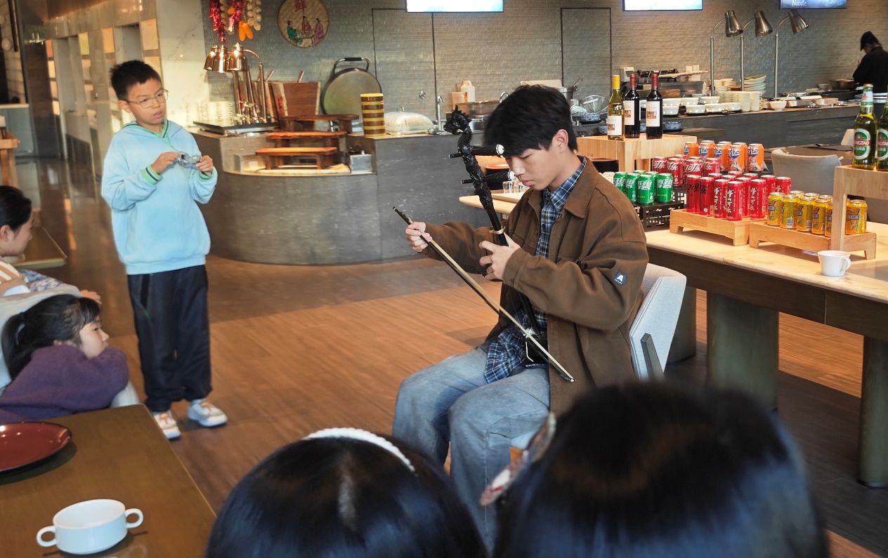 京劇講座結(jié)束后,司蘇銘老師為小記者們帶來了二胡的介紹與演奏。司老師先是向小記者們講解了二胡的歷史淵源、構(gòu)造特點(diǎn)以及演奏技巧。他介紹道,二胡是中國傳統(tǒng)拉弦樂器,至今已有一千多年的歷史,由琴筒、琴桿、琴皮、琴弦、琴弓等部分組成,音色優(yōu)美動聽,既能表現(xiàn)激昂豪邁的情緒,也能抒發(fā)細(xì)膩柔美的情感。在講解過程中,老師還現(xiàn)場展示了二胡的各個(gè)部件,讓小記者們近距離觀察。