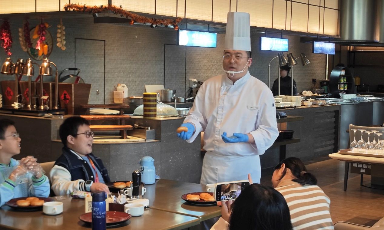 甜品DIY環(huán)節(jié)正式拉開帷幕。此次負(fù)責(zé)指導(dǎo)小記者們制作甜品的是酒店餅房廚師長張振旺,他的履歷堪稱亮眼——曾任日本知名品牌ITALIAN TOMATO(上海區(qū)域)主廚、意大利奢華甜品品牌COVA(上海區(qū)域)產(chǎn)品研發(fā)主廚&首席翻糖師,還曾為國內(nèi)多位知名明星訂制翻糖蛋糕及生日蛋糕,同時(shí)擔(dān)任過萬達(dá)、雅高、萬豪、洲際酒店集團(tuán)的餅房廚師長,更是歷峰國際烘焙俱樂部成員。