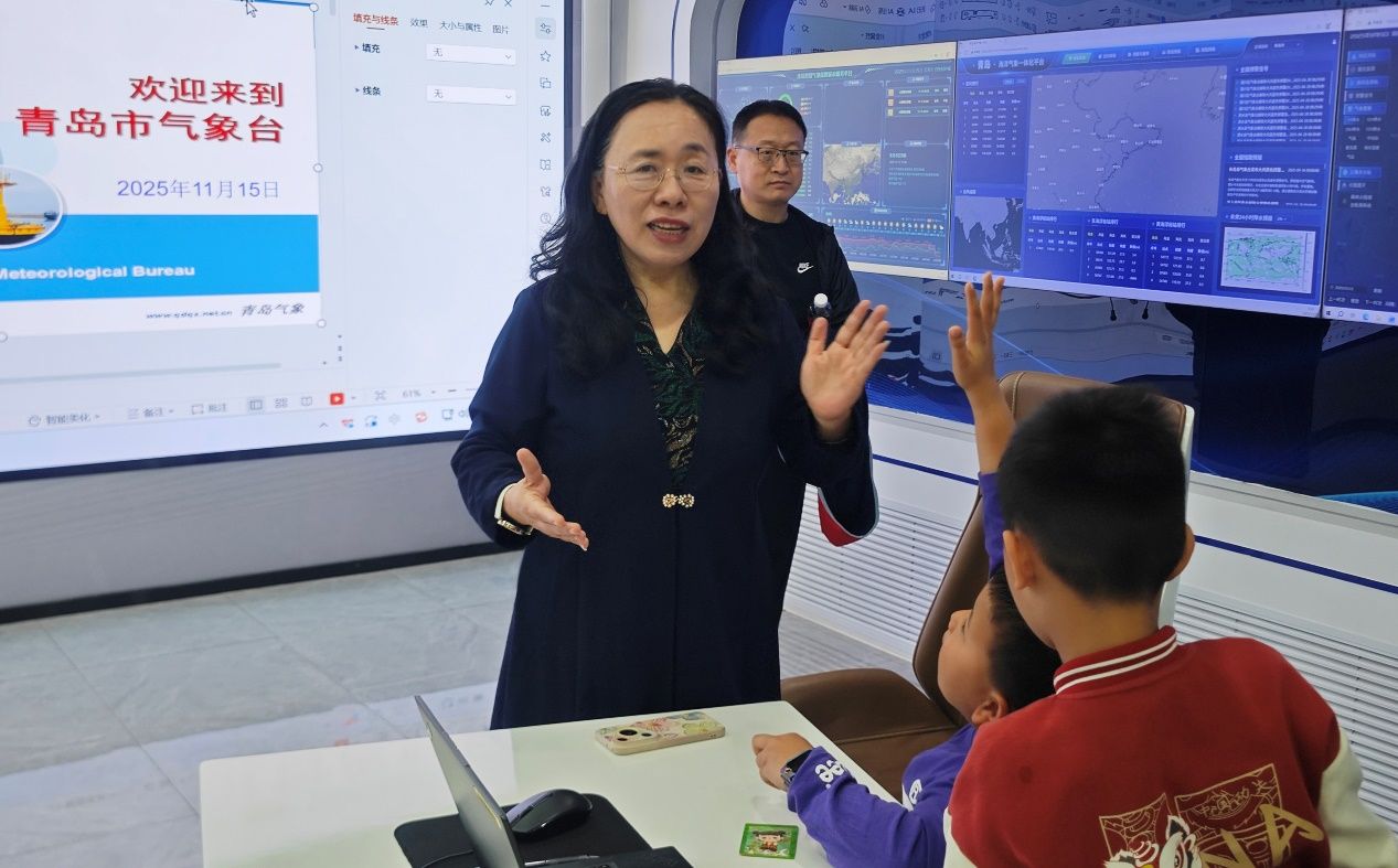 活動伊始,青島市氣象學(xué)會秘書長耿敏熱情接待了小記者們,她用生動通俗的語言開啟了氣象知識啟蒙。她介紹,天氣預(yù)報作為預(yù)測未來天氣的科學(xué)方法,早已深度融入日常生活、農(nóng)業(yè)生產(chǎn)、交通出行、能源調(diào)度等方方面面。“提前預(yù)判臺風(fēng)路徑能讓沿海地區(qū)做好防護,精準預(yù)報降雨可幫助農(nóng)民安排灌溉或防澇,就連大家周末出游的計劃,也離不開天氣預(yù)報的參考?!惫⒚裘貢L的講解讓小記者們恍然大悟,原來看似簡單的天氣播報,背后藏著關(guān)乎民生的大學(xué)問。