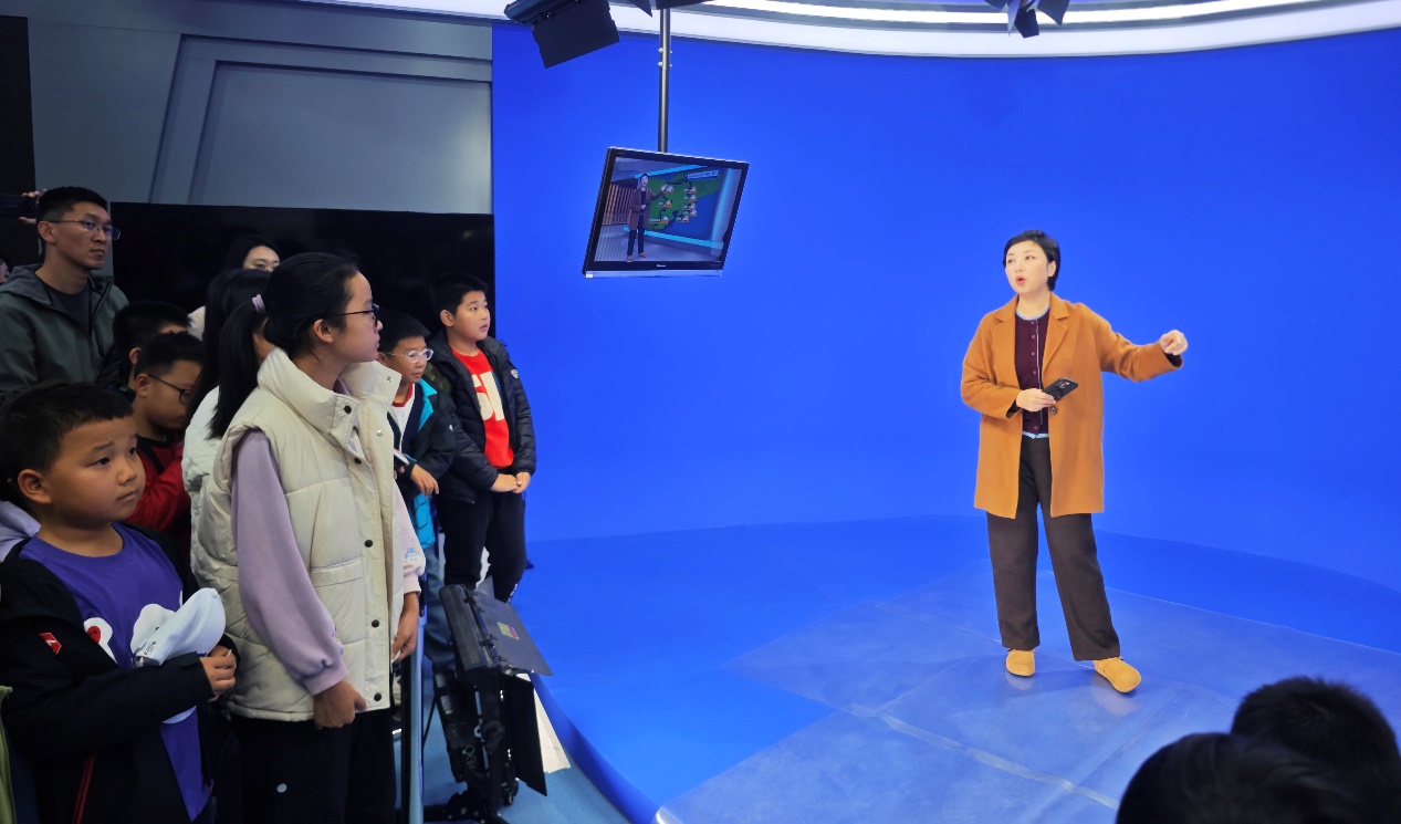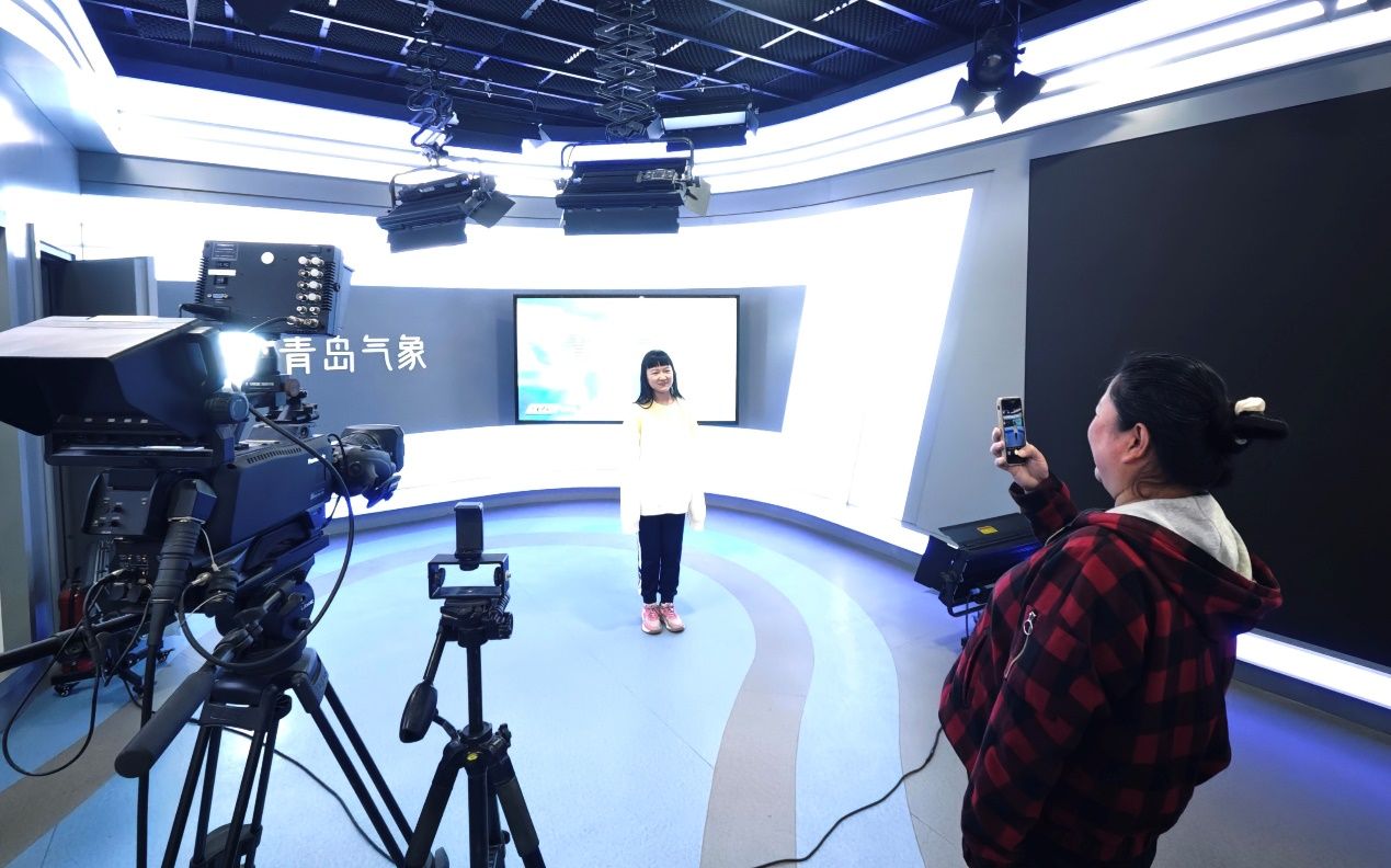 隨后,小記者探訪了氣象演播室。眼前的場景讓大家充滿疑惑:電視里清晰可見的天氣地圖,在演播室里卻變成了純凈的藍色幕布和墻壁。青島市氣象服務(wù)中心氣象主播張霞笑著揭開謎底,這是“摳像”技術(shù)在氣象播報中的應(yīng)用。通過這項視頻制作技術(shù),能將主播從藍綠背景中分離,再與天氣地圖等背景合成,呈現(xiàn)出觀眾看到的完整畫面。更有趣的是,主播播報時并無真實地圖參考,全靠經(jīng)驗比劃手勢、緊盯文字提示器完成講解。