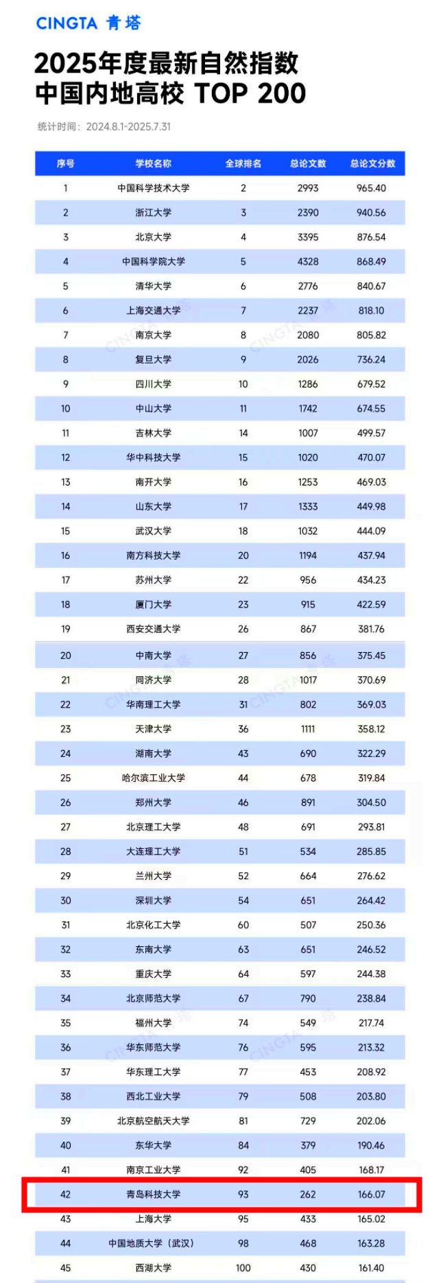 近日,自然指數(shù)(Nature Index)官網(wǎng)發(fā)布了最新自然指數(shù)排名(統(tǒng)計(jì)時(shí)間節(jié)點(diǎn)為2024.8.1-2025.7.31),青島科技大學(xué)自然指數(shù)排名再創(chuàng)新高,位居全球高校第93位,首次躋身全球前100強(qiáng),在中國(guó)內(nèi)地高校自然指數(shù)排名中位居第42位,實(shí)現(xiàn)了歷史性突破,標(biāo)志著學(xué)校在自然科學(xué)領(lǐng)域的綜合實(shí)力明顯增強(qiáng)。