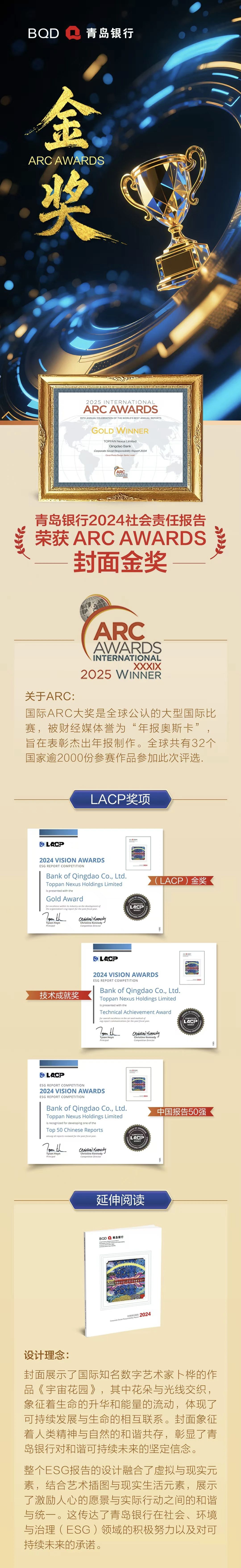 作為“A+H”上市銀行,青島銀行也高度重視社會責(zé)任(ESG)報告的編制和發(fā)布工作,已連續(xù)9年披露獨(dú)立的社會責(zé)任報告(ESG)報告,以推動企業(yè)可持續(xù)發(fā)展。歷年報告緊密圍繞ESG指標(biāo)體系進(jìn)行披露。2024年度報告更創(chuàng)新設(shè)計風(fēng)格,系統(tǒng)披露了青島銀行在服務(wù)國家戰(zhàn)略、賦能實(shí)體經(jīng)濟(jì)、促進(jìn)民生改善以及推動綠色低碳轉(zhuǎn)型等領(lǐng)域的創(chuàng)新實(shí)踐與突出成果,一舉斬獲有“年報奧斯卡”之稱的美國媒體專業(yè)聯(lián)盟(LACP)全球ESG報告競賽金融業(yè)金獎。