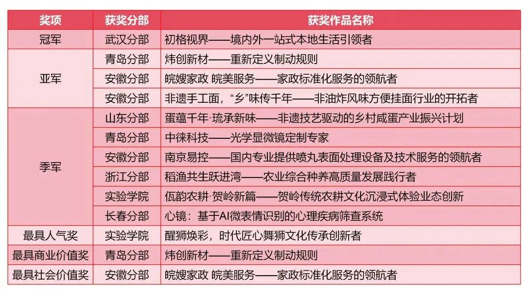 經(jīng)過激烈角逐,本屆大賽共有19支隊(duì)伍進(jìn)入現(xiàn)場賽?,F(xiàn)場賽包含半決賽、決賽兩個(gè)環(huán)節(jié),評審專家從個(gè)人成長、項(xiàng)目創(chuàng)新、產(chǎn)業(yè)價(jià)值、團(tuán)隊(duì)合作及現(xiàn)場表現(xiàn)等5個(gè)方面對參賽作品進(jìn)行評分。最終,來自武漢分部的作品獲得冠軍,來自青島分部、安徽分部的作品獲得亞軍,來自山東分部、青島分部、安徽分部、浙江分部、國家開放大學(xué)實(shí)驗(yàn)學(xué)院、長春分部的作品獲得季軍。大賽還評出了最具人氣獎(jiǎng)、最具商業(yè)價(jià)值獎(jiǎng)和最具社會(huì)價(jià)值獎(jiǎng)等獎(jiǎng)項(xiàng)。