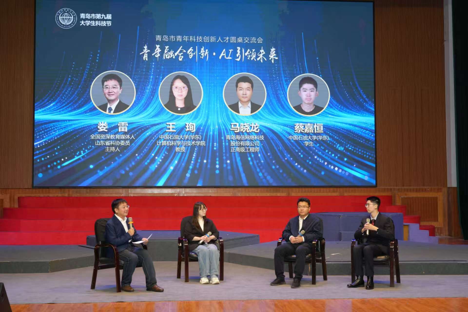 閉幕式上舉辦“青年融合創(chuàng)新·AI引領(lǐng)未來”圓桌交流會,全國資深教育媒體人、省科協(xié)委員、省科學(xué)家精神宣講團專家婁雷、中國石油大學(xué)(華東)計算機科學(xué)與技術(shù)學(xué)院教授王珣、海信網(wǎng)絡(luò)科技股份有限公司技術(shù)總監(jiān)正高級工程師馬曉龍、中國石油大學(xué)(華東)學(xué)生蔡嘉恒等四位嘉賓圍繞人工智能發(fā)展展開深度對話。