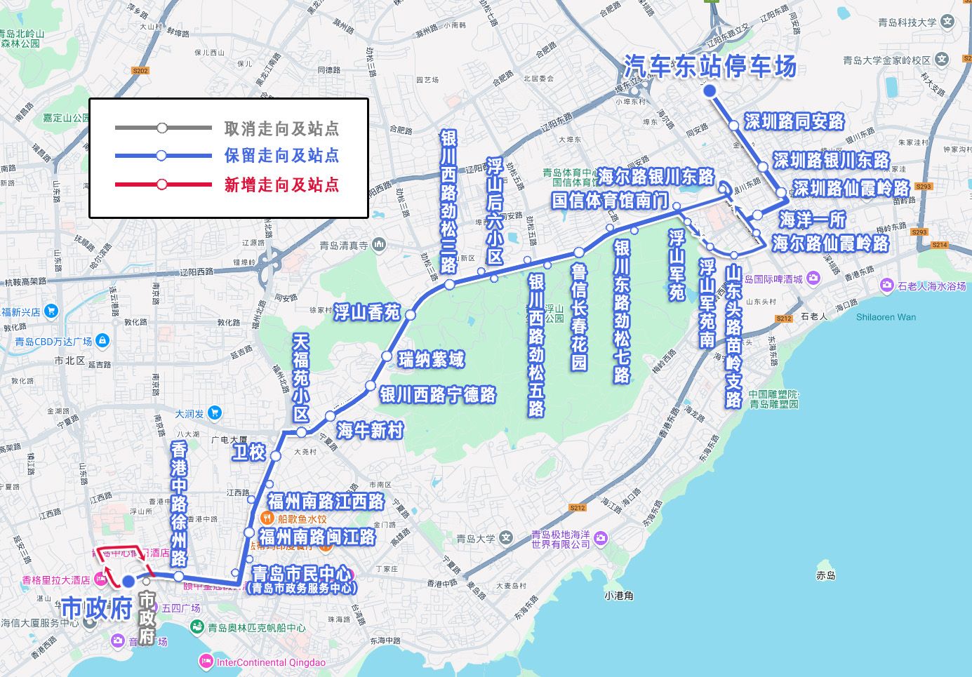 上行:自香港中路北側(cè)的“市政府”返程站,沿香港中路、山東路、閩江路、新浦路、香港中路至“香港中路徐州路”車站,恢復(fù)原路線至“汽車東站停車場(chǎng)”車站止。