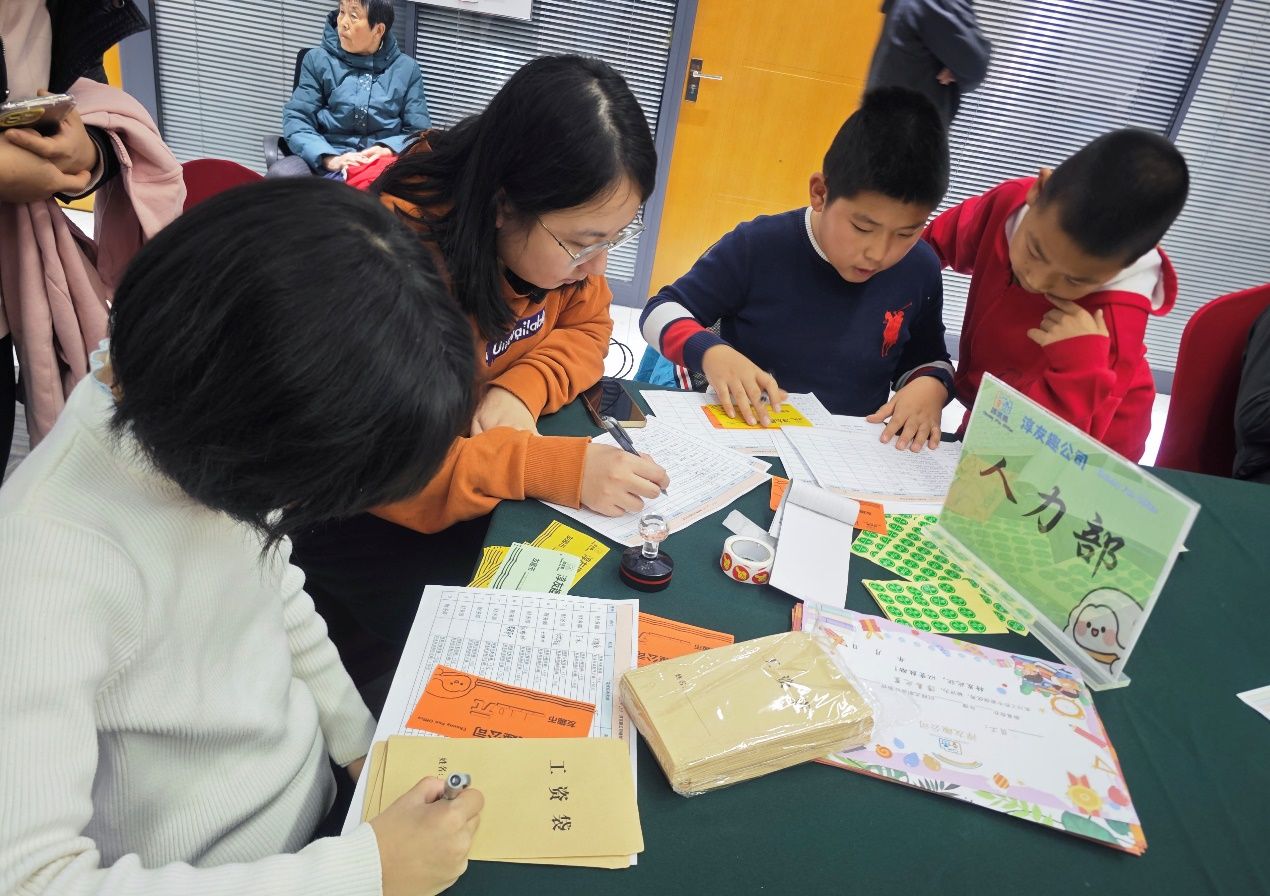 財(cái)務(wù)部?jī)?nèi),小記者們化身“數(shù)字管家”,認(rèn)真學(xué)習(xí)填寫(xiě)收據(jù)和賬本,全程參與資金流轉(zhuǎn)全流程。從區(qū)分“收入”與“支出”,到規(guī)范登記每一筆流水賬,再到精準(zhǔn)核算公司利潤(rùn)與員工工資,小記者們?cè)诜磸?fù)核對(duì)中體會(huì)到“數(shù)據(jù)嚴(yán)謹(jǐn)性”的重要意義。“每一筆數(shù)字都不能錯(cuò),不然公司就會(huì)算錯(cuò)賬!”一位專(zhuān)注記賬的小記者認(rèn)真地提醒同伴,在實(shí)踐中切實(shí)掌握了基礎(chǔ)財(cái)商技能。