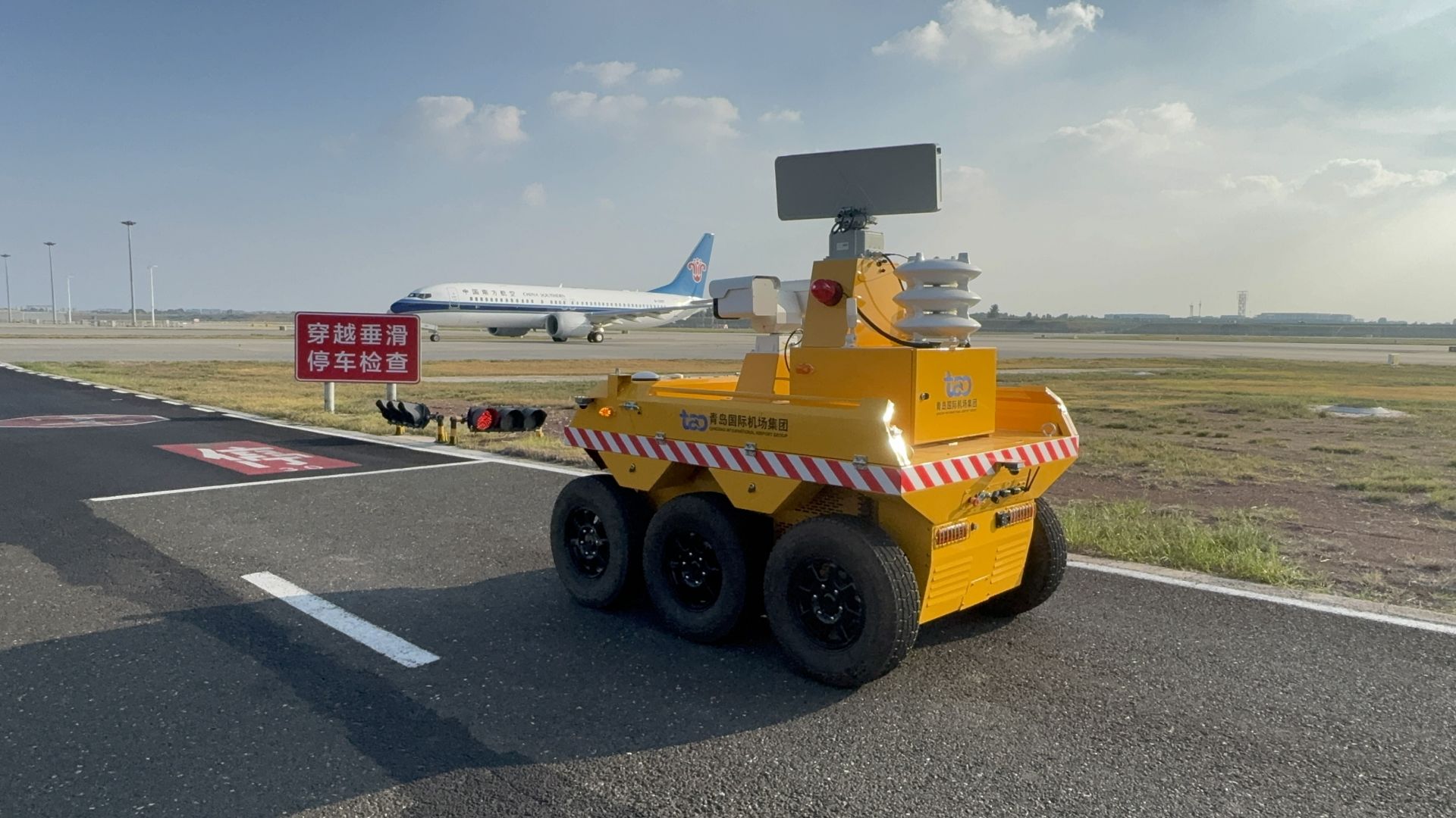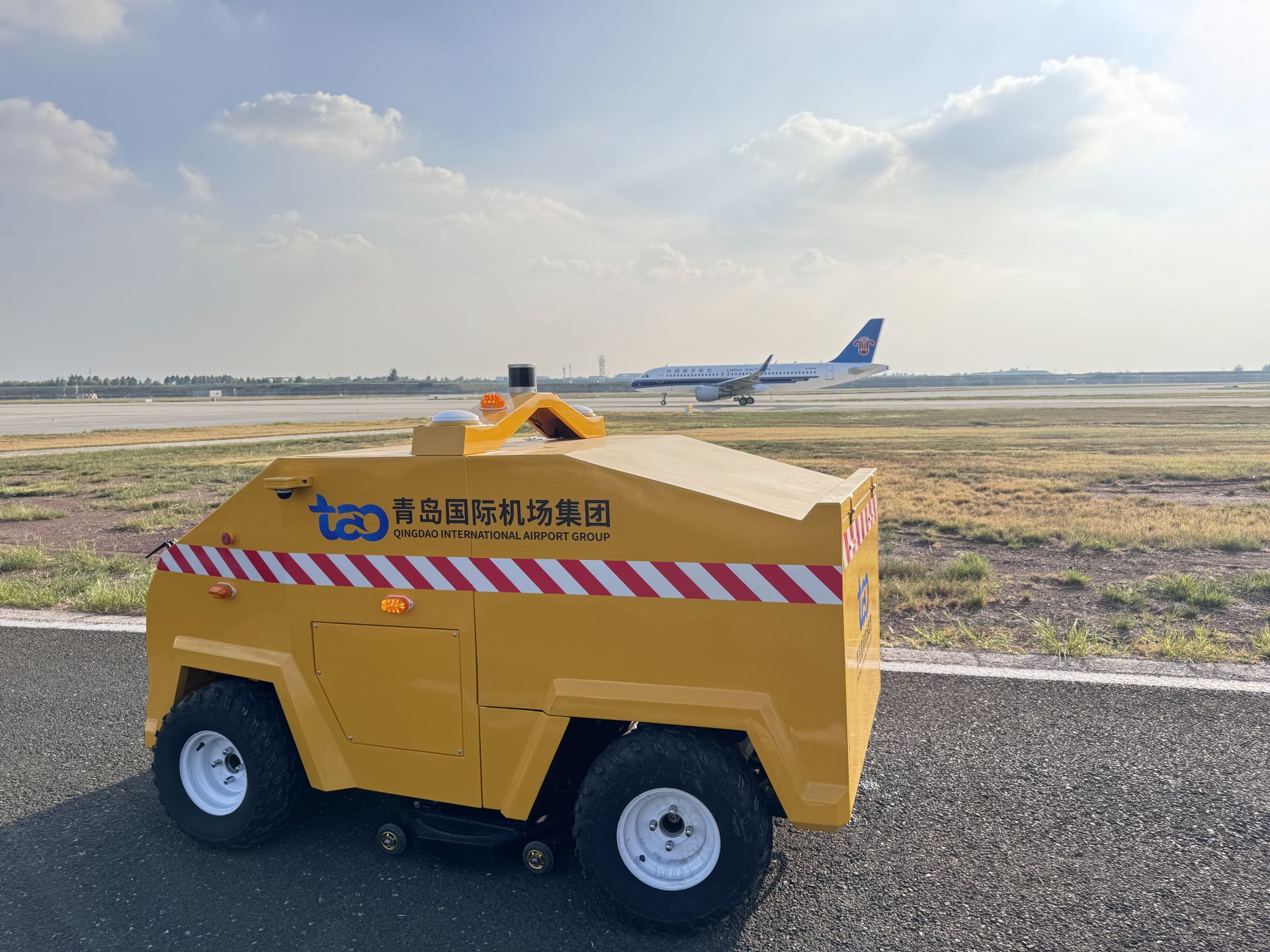 近年來,青島機(jī)場以5G技術(shù)為支撐,聚焦L4級車路協(xié)同無人駕駛系統(tǒng)的研發(fā)與應(yīng)用,圍繞多類車型的實際運營場景展開系統(tǒng)性研究。牽頭發(fā)布2項團(tuán)體標(biāo)準(zhǔn),參編多項行業(yè)標(biāo)準(zhǔn),并與中機(jī)檢測、西井科技達(dá)成戰(zhàn)略合作,為行業(yè)無人化運行提供重要技術(shù)參考。團(tuán)隊自主研發(fā)的雷達(dá)紅綠燈系統(tǒng),巧妙打通了無人駕駛車輛與飛機(jī)之間的安全協(xié)同通道,實現(xiàn)了從“隔離運行”到“智能協(xié)同”的跨越。成功研發(fā)的具備自主知識產(chǎn)權(quán)的行業(yè)首款集成多種作業(yè)功能的無人驅(qū)鳥車、無人割草機(jī),大幅提升了機(jī)場場道作業(yè)效率與智能化水平,已吸引10余家機(jī)場采購意向。青島機(jī)場還牽頭建成民用機(jī)場首個無人駕駛車輛檢測基地,為行業(yè)設(shè)備的準(zhǔn)入驗證與性能測試提供平臺,同時編制形成專項測試保障方案,獲得民航華東地區(qū)管理局支持。
