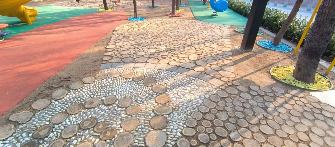 據(jù)相關(guān)負(fù)責(zé)人介紹,為了讓樹木更好生長(zhǎng),金嶺山公園每年都會(huì)進(jìn)行修枝撫育。對(duì)產(chǎn)生的剩余物粉碎、染色后,均勻地鋪在樹坑內(nèi),紅色、黃色、藍(lán)色,猶如給樹木蓋上了彩色被子。除了美觀裝飾的作用外,還能為根系提供保濕保溫。另外,伐除的枯枝和木樁也不浪費(fèi),夯入地面平整場(chǎng)地,替代了以往的水泥石材等硬質(zhì)鋪裝方式。