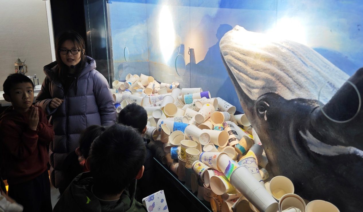 展區(qū)內(nèi)一件名為“鯨魚的眼淚”的藝術(shù)展品,引發(fā)了小記者對環(huán)保的深刻思考。講解員老師介紹,這件作品旨在倡導(dǎo)大家少用紙杯,保護(hù)海洋生態(tài)與地球家園。小記者紛紛表示,今后會從自身做起,減少一次性用品的使用,踐行綠色生活理念。