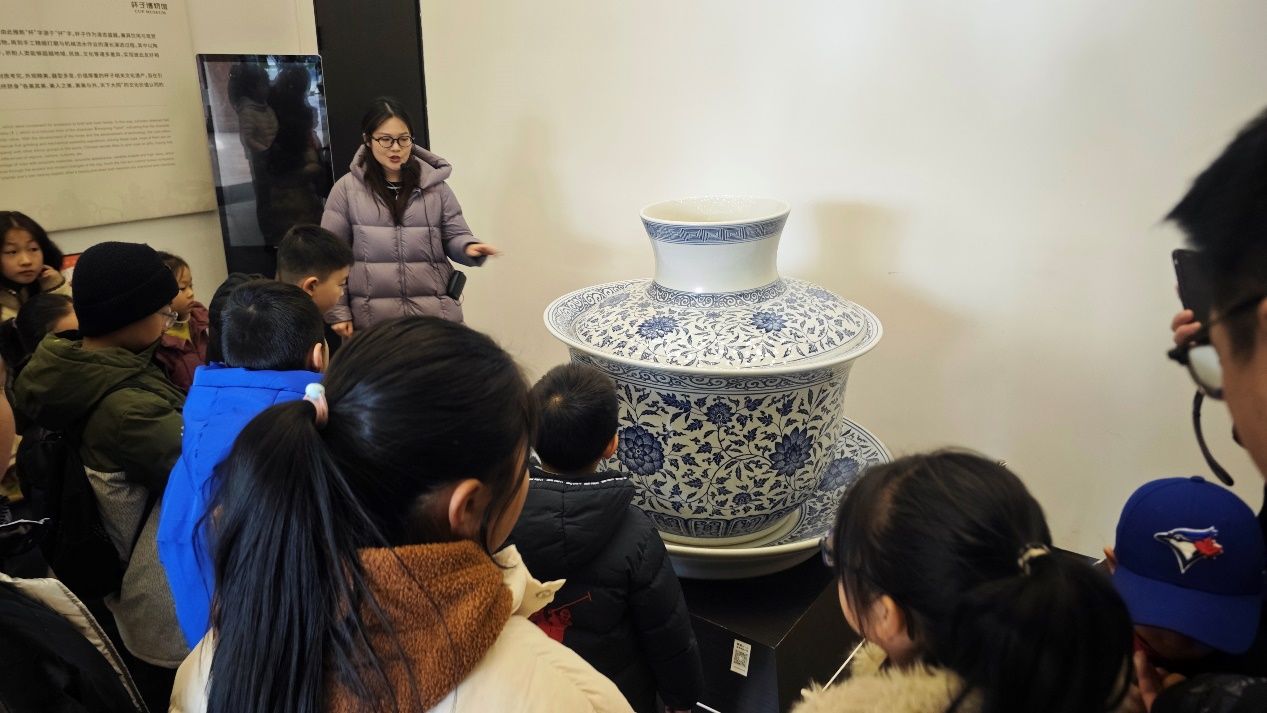 一進(jìn)館門,展廳入口處矗立的“天下第一大蓋杯/碗”便讓小記者發(fā)出陣陣驚嘆。這只直徑達(dá)1.1m×1.08m的巨型陶瓷器,是景德鎮(zhèn)師傅們歷時兩年精心燒制而成,作為目前國內(nèi)已知的最大陶瓷蓋杯/碗,其雄渾的氣勢與精湛的工藝令人震撼。小記者紛紛圍攏上前,有的踮起腳尖仔細(xì)打量釉色紋理,有的拿出筆記本記錄關(guān)鍵信息,還有的與這一“巨無霸”展品合影留念,快門聲定格下這份初見的驚喜。
