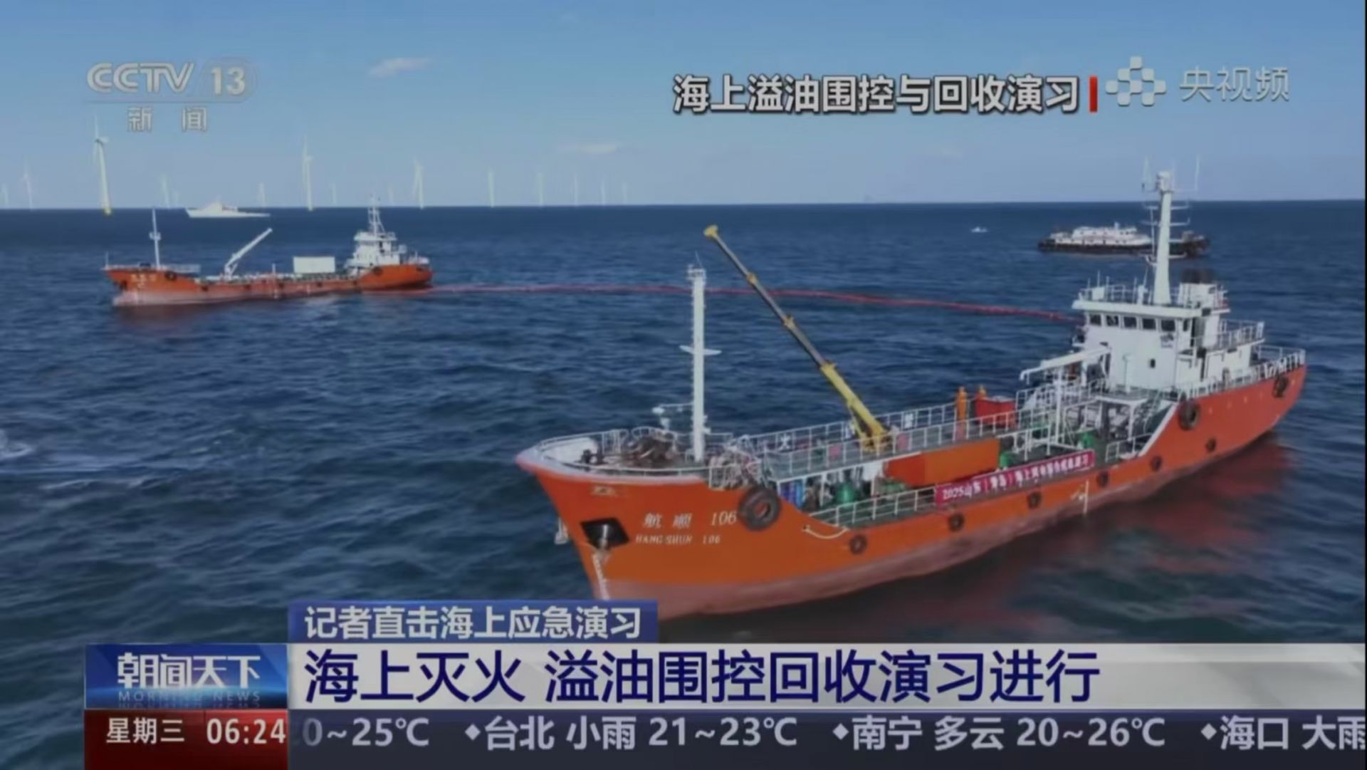 《朝聞天下》節(jié)目對 “2025年山東(青島)”海上風(fēng)電綜合應(yīng)急演習(xí)進(jìn)行的播放畫面