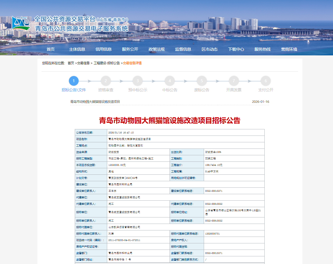 日前,青島市公共資源交易電子服務(wù)系統(tǒng)正式發(fā)布《青島市動(dòng)物園大熊貓館設(shè)施改造項(xiàng)目招標(biāo)公告》(以下簡(jiǎn)稱《公告》)。