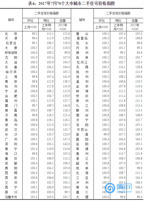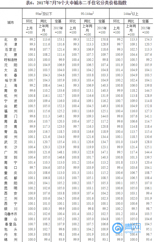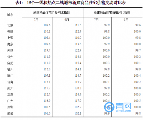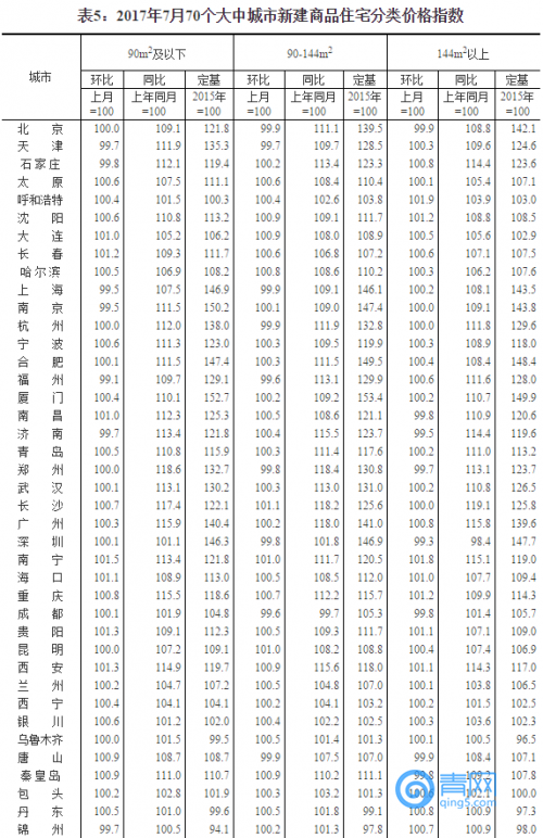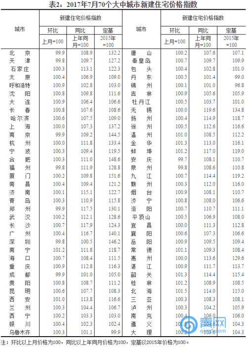 國家統(tǒng)計(jì)局今日發(fā)布了2017年7月份70個(gè)大中城市住宅銷售價(jià)格統(tǒng)計(jì)數(shù)據(jù)。數(shù)據(jù)顯示,15個(gè)一線和熱點(diǎn)二線城市新建商品住宅價(jià)格同比漲幅繼續(xù)全部回落,10個(gè)城市環(huán)比下降或持平;70個(gè)大中城市中一二線城市房價(jià)同比漲幅持續(xù)回落;70個(gè)大中城市中環(huán)比持平或下降城市個(gè)數(shù)增加。
